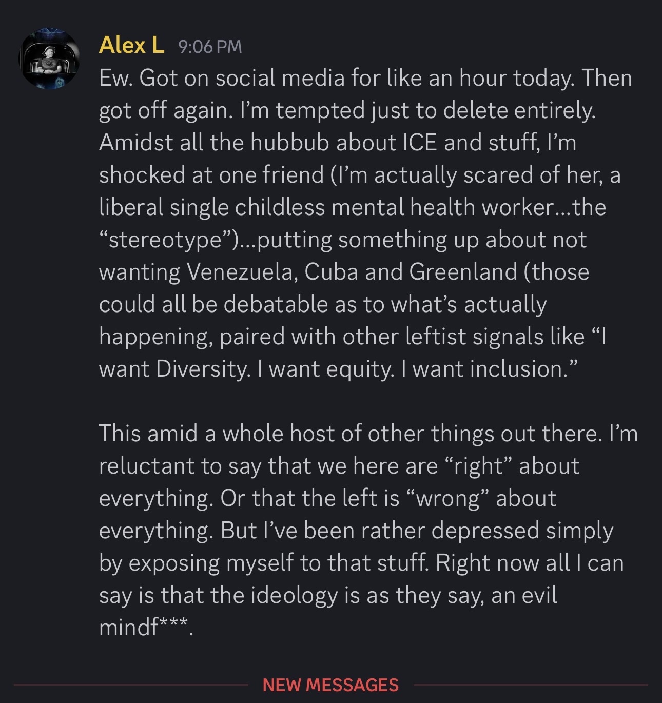 STBX invited us over for soup. Roommate was talking about grief counseling. Mentioned that two of her grief consultations were due to deportations, while giving me a look. STBX gave me a fearful side glance as well. My visceral thought: these are not my people. They think that I am evil for believing in borders and reasonable screening criteria for immigration. They have been amped-up on Renee Good, Minneapolis agit-prop. I felt like leaving immediately.